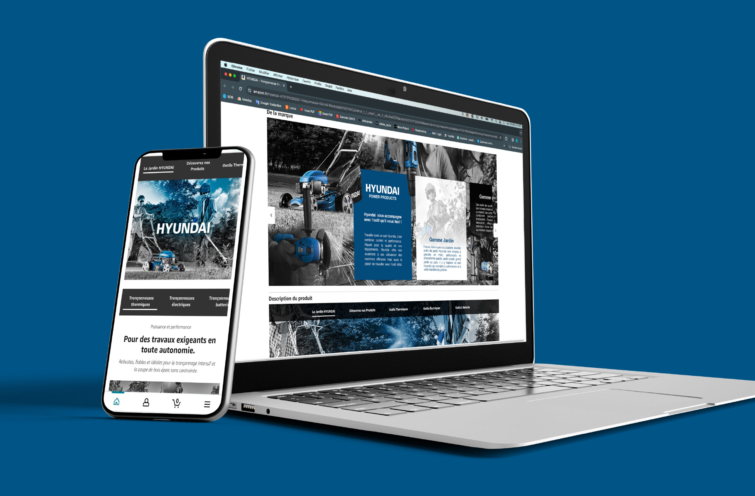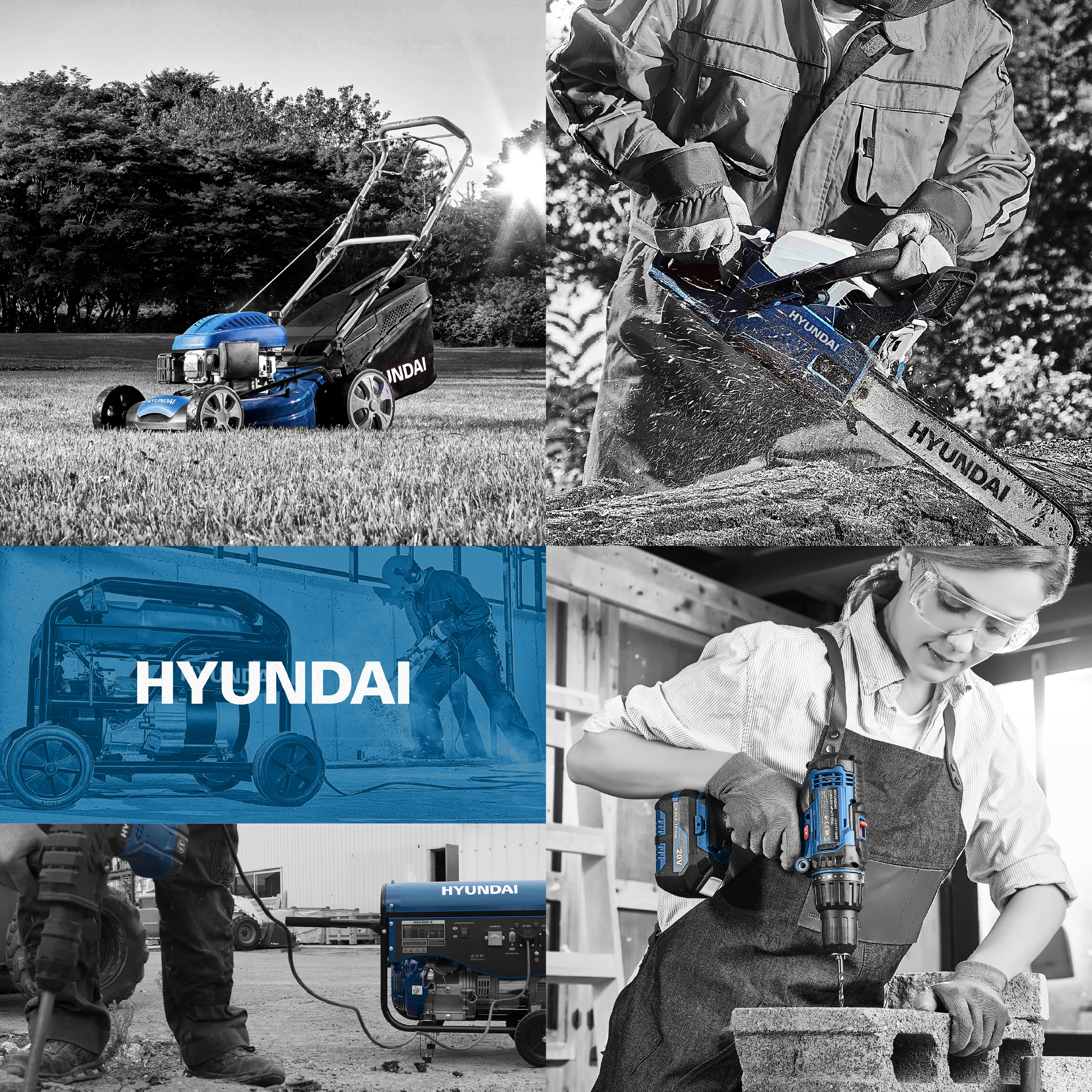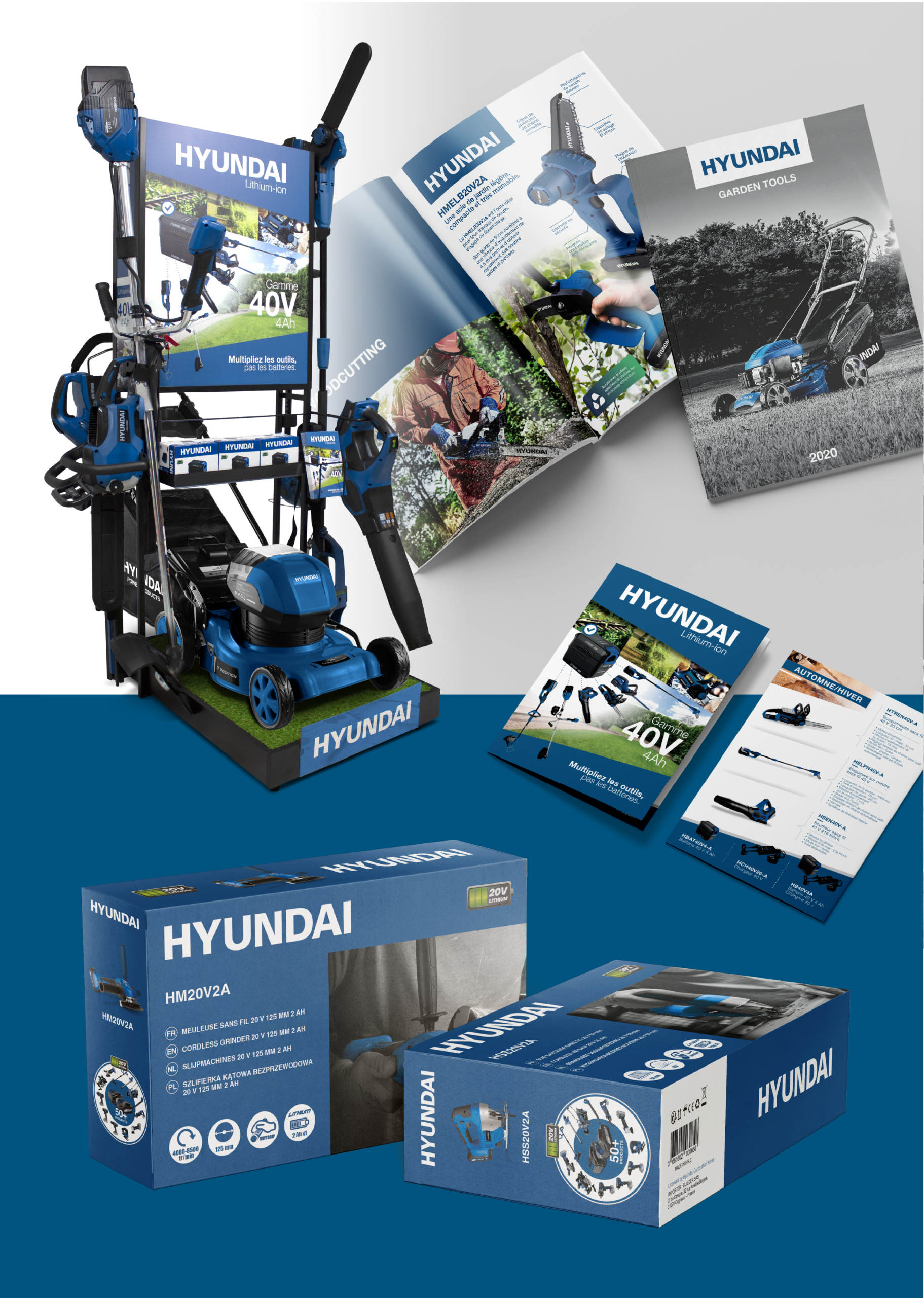 Le projet Hyundai Power Products s’est inscrit dans un cadre graphique international, défini par la marque. Mon travail a consisté à gérer l'identité de marque pour le segment produit "outils de bricolage et jardinage", et à respecter, appliquer et décliner cette charte graphique avec précision sur l’ensemble des supports, en veillant à préserver la cohérence, la lisibilité et l’équilibre de l’univers visuel, quels que soient les formats ou les contextes, afin qu’elle reste immédiatement identifiable tout en s’adaptant à toutes les contraintes print ou web.