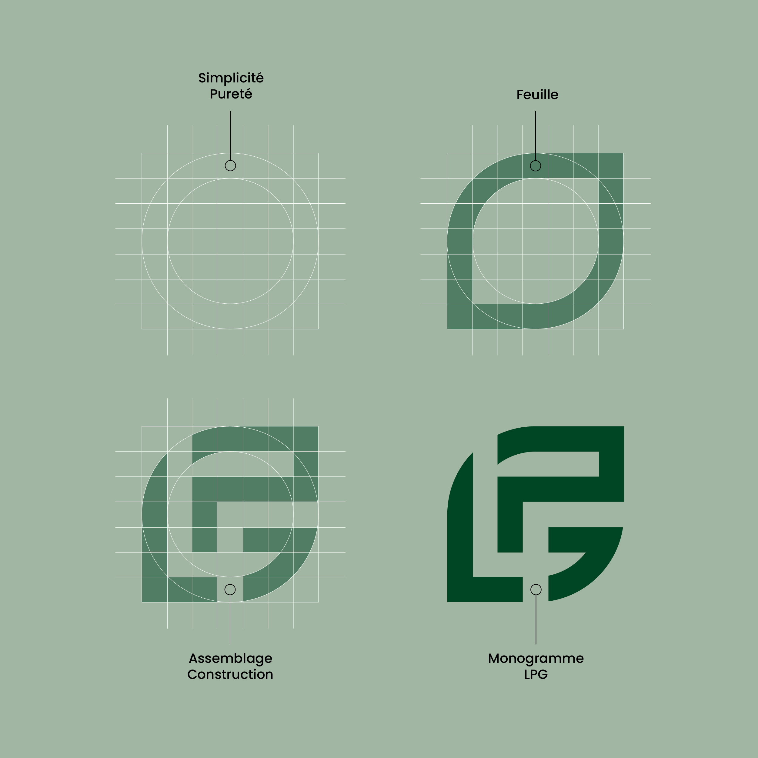 Un monogramme sculpté autour des lettres L, P et G, comme trois pièces de bois qui s’assemblent et se complètent, et qui révèlent une forme de feuille venant souligner la dimension organique de la matière qu'il façonne.